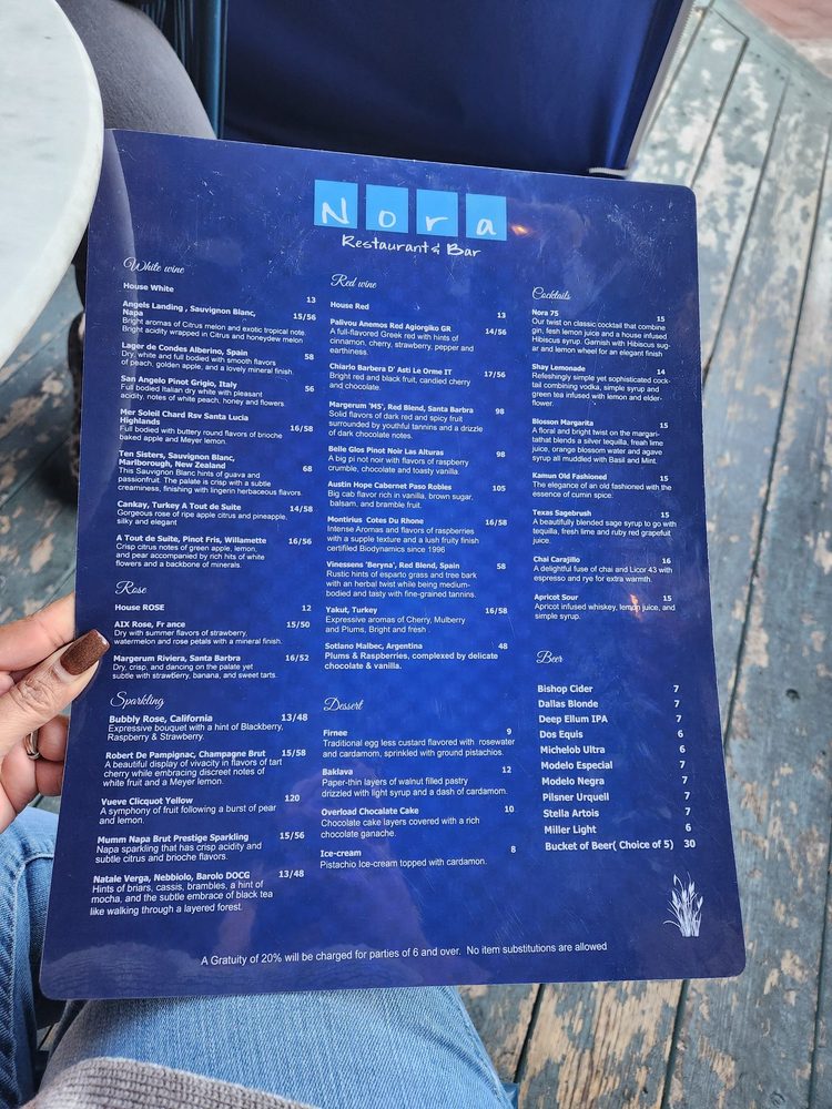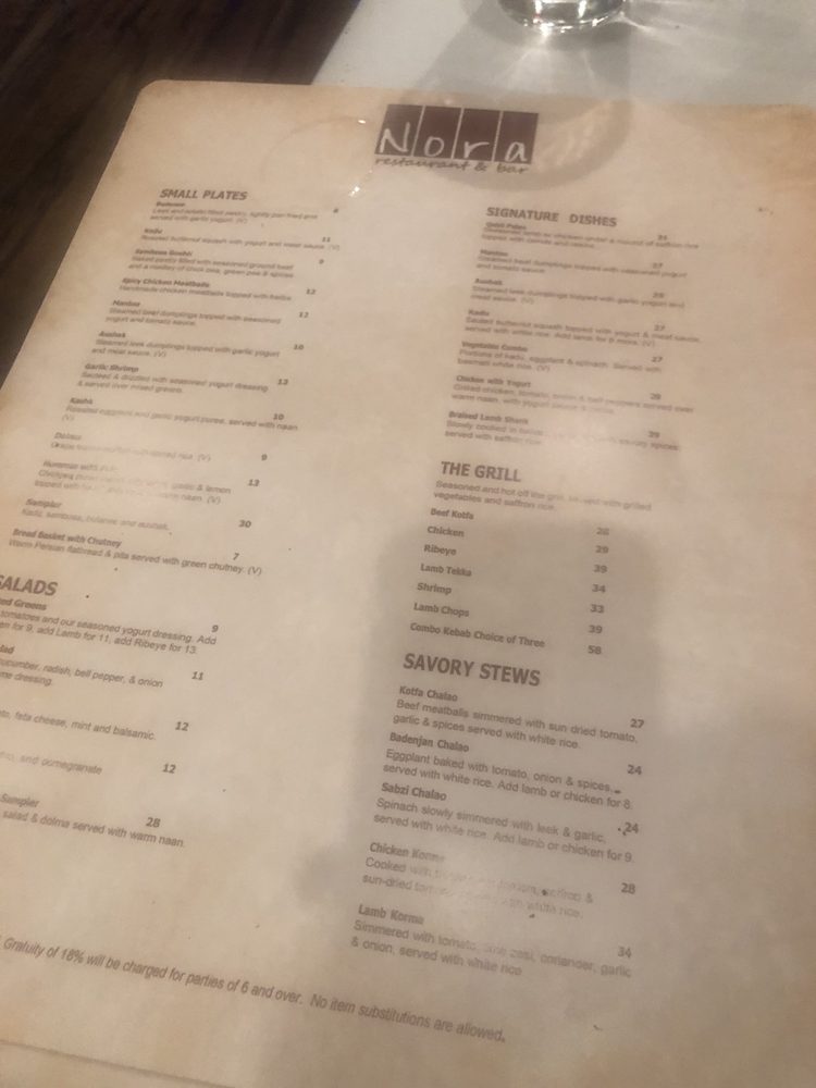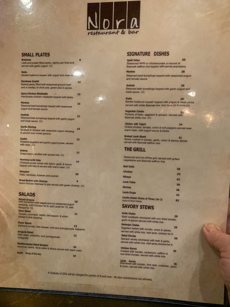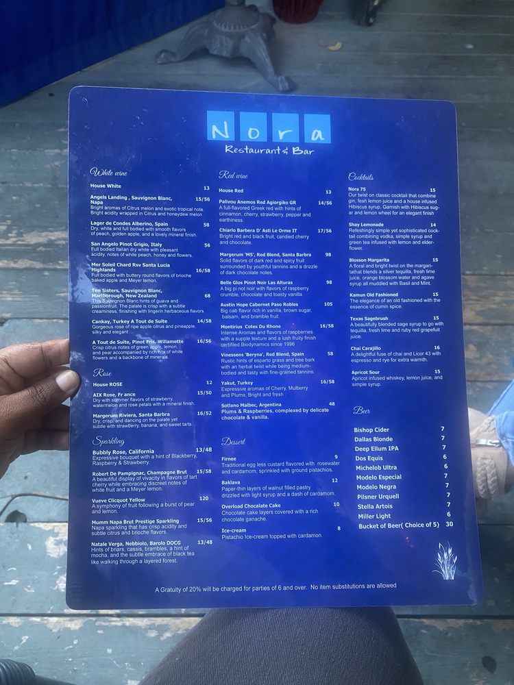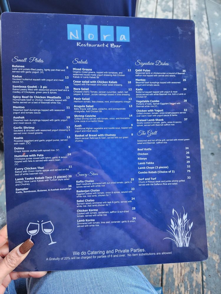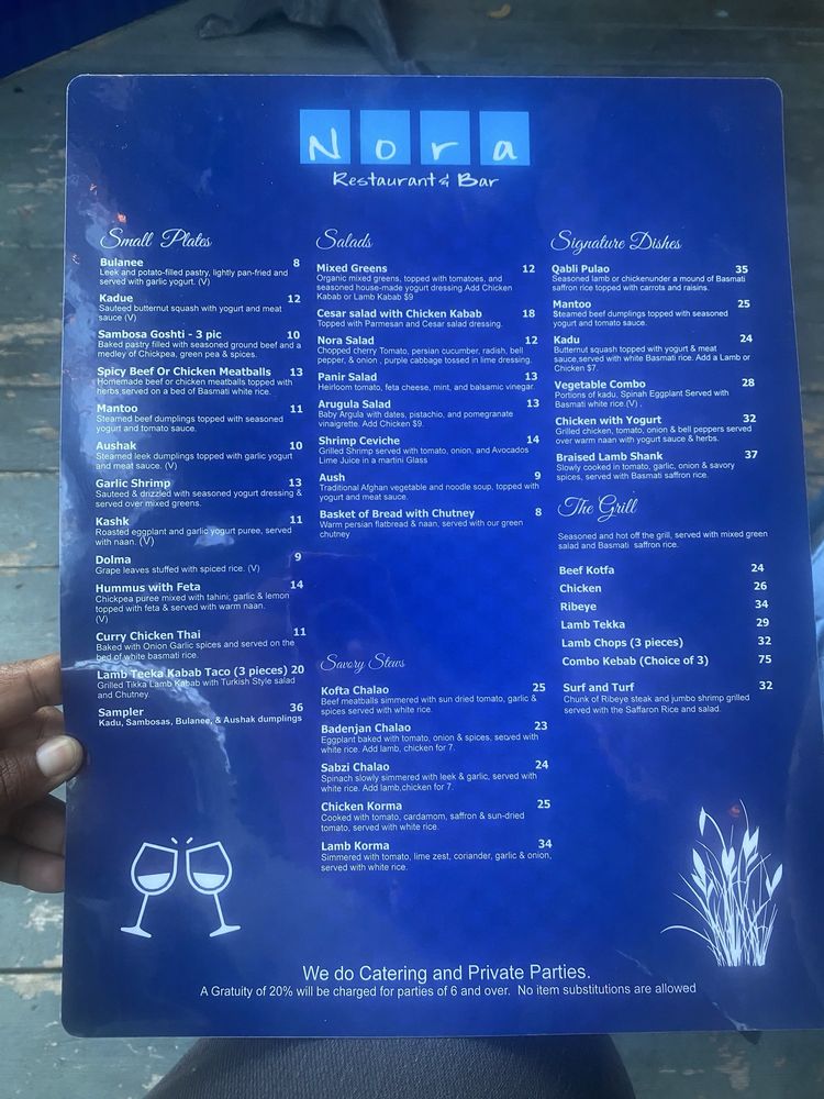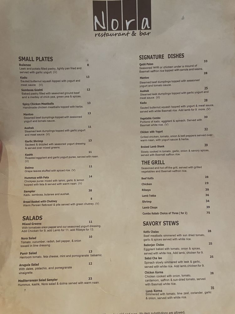 Introducing the menu at Nora Restaurant and Bar, located in Dallas, TX, a Mediterranean and Afghan fusion spot offering a wide range of options for every palate. From small plates like Bulanee Vegetarian and Spicy Chicken Meatballs to signature dishes like Qabli Pulao and Chicken with Yogurt, all dishes are bursting with unique flavors. The grill section offers Beef Kofta, Ribeye, and more, perfect for meat lovers. Customers rave about the flavorful and tender lamb, the delicious grilled shrimp ceviche, and the refreshing signature cocktails like Texas Sagebrush. With an inviting atmosphere, attentive service, and a diverse menu, Nora Restaurant and Bar is the ideal spot for a memorable dining experience. Embrace the bold and savory tastes of Afghanistan at Nora.