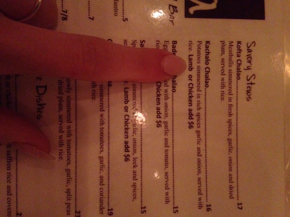 Eggplant baked with tomato, onion, and spices, served with white rice. Add lamb or chicken for an additional charge.
